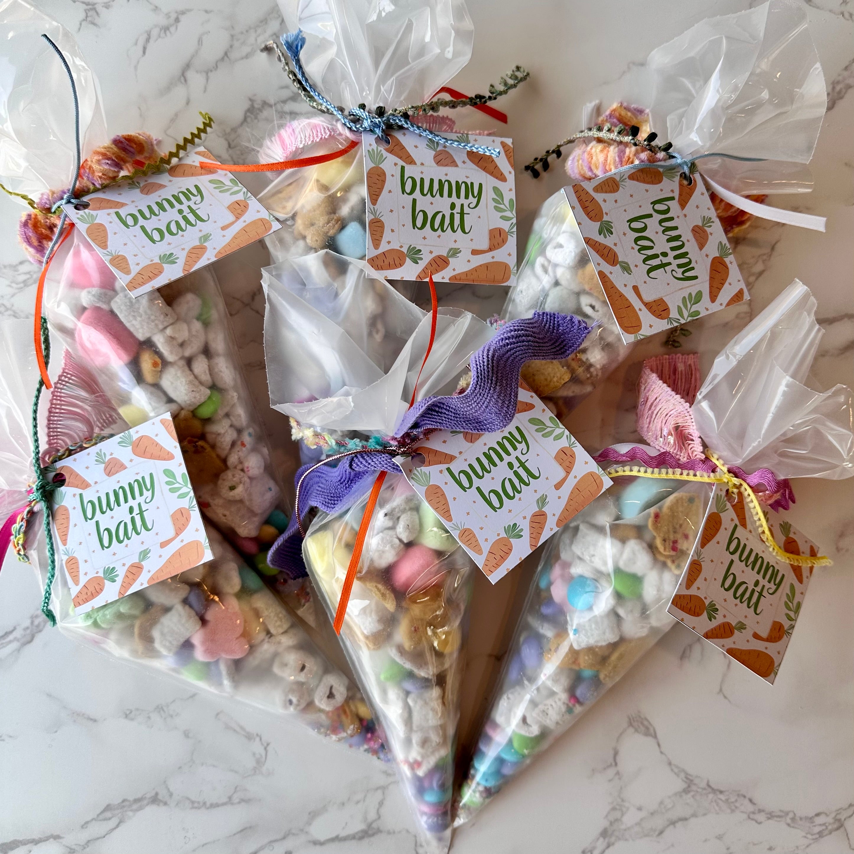 Bunny Bait: M&M's, sprinkles, marshmallows, graham crackers, bunny grahams, cheerios, Chex cereal, pretzels, powdered sugar, and white chocolate.
